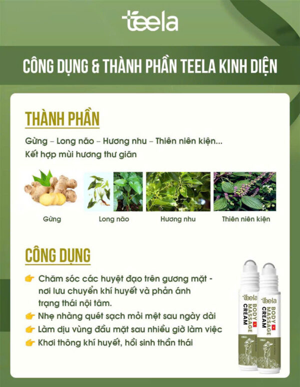Với các thành phần chủ đạo như: Gừng, long não, hương nhu, thiên niên kiện,… kết hợp với mùi hương thư giãn. Lăn Teela 10ml Diện Kinh có công dụng: